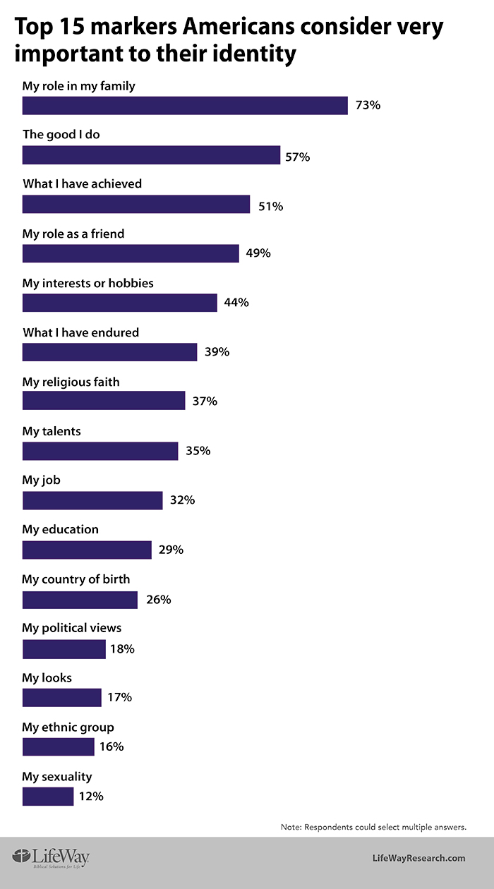“There is no single lens or identifier Americans use to think of themselves,” said Scott McConnell, executive director of LifeWay Research. “Ironically, that means the personal identity people have or seek may not be what others see in them.”