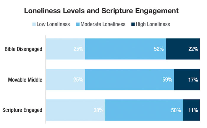 But when the Bible enters the equation, only 11 percent of Scripture-engaged respondents reported high levels of loneliness, compared to 22 percent of those considered Bible-disengaged, with Scripture engagement defined as those who score 100 or higher on a scale judging the frequency of Bible readership and its impact on and centrality to a reader’s daily life.