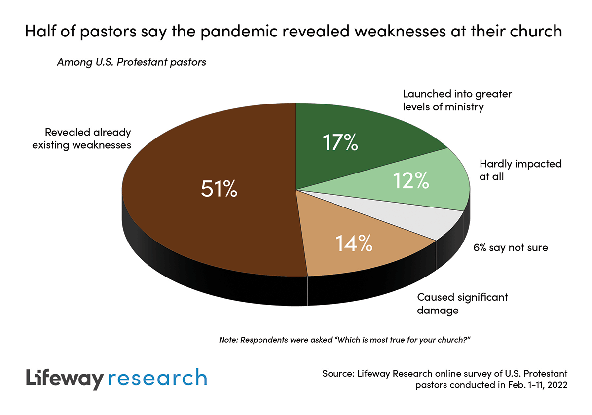 The pandemic continues to have a lasting impact on congregations, and most pastors say that it’s been a negative one. Half (51 percent) say COVID-19 revealed weaknesses that already existed in their ministry, and 14 percent say the pandemic caused considerable damage to the church’s ministry. Far fewer say COVID-19 has hardly had any ministry impact on the congregation (12 percent) or has launched the church to greater levels of ministry (17 percent).