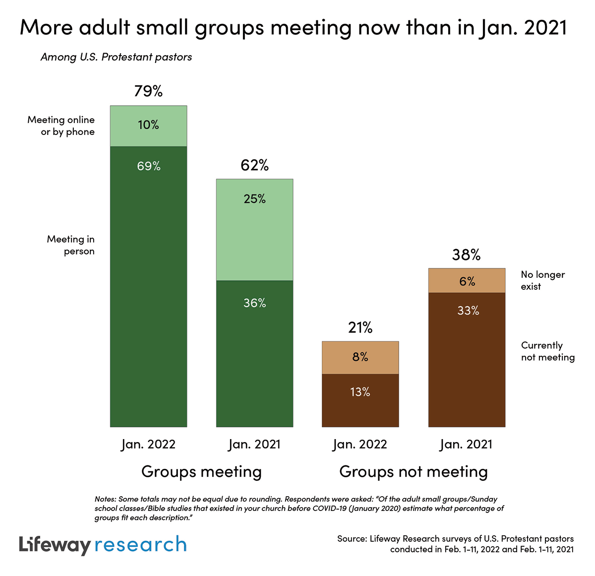 More small groups are meeting now, and more are meeting in person compared to last January. On average, pastors now report 79 percent of their small group classes for adults that existed prior to the pandemic are now meeting, including 69 percent that are gathering in person.