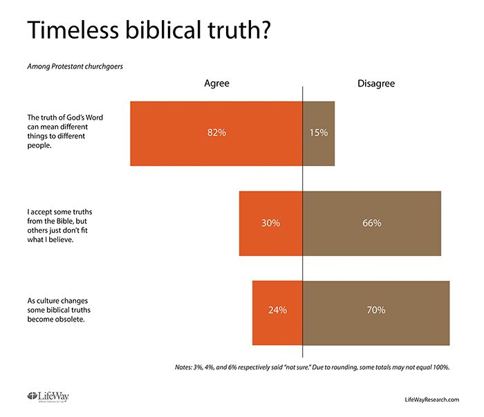 For 82 percent of churchgoers, the truth of God’s Word can mean different things to different people, with 15 percent disagreeing.