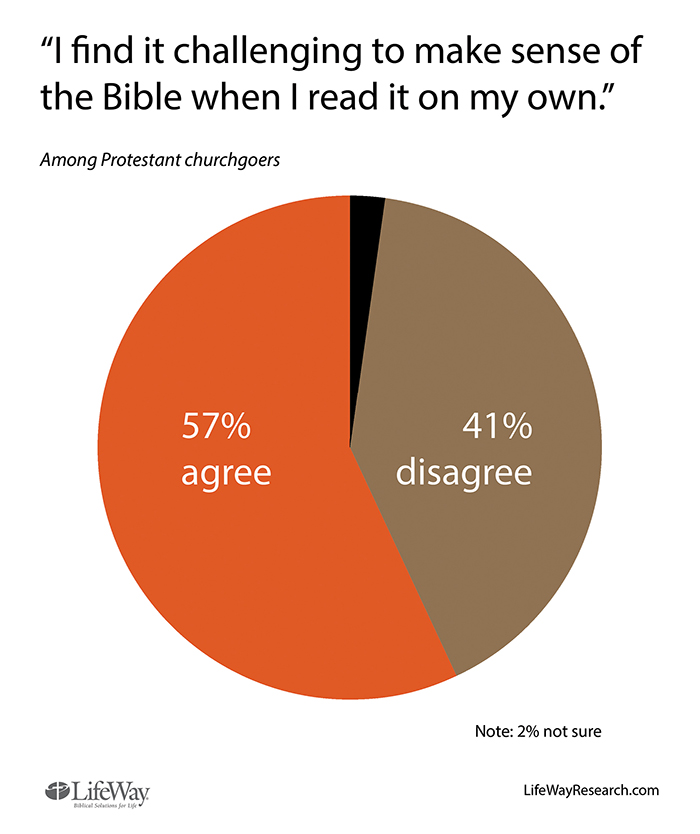 Despite repeatedly affirming confidence in their own abilities to explain and understand the Bible, a recent LifeWay Research study in partnership with Explore the Bible curriculum found 57 percent of Protestant churchgoers say they find it challenging to make sense of the Bible when they read it on their own.