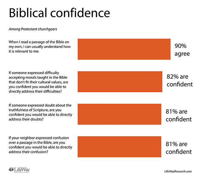 Four in 5 express confidence in their ability to help others with doubts about the truthfulness of Scripture (81 percent), difficulty accepting morals taught in the Bible (82 percent), and confusion over a Bible passage (81 percent).