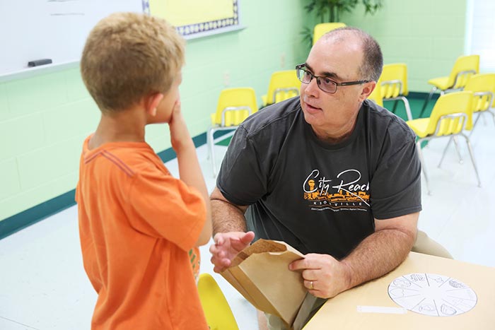 Joe Sorah, of the Tennessee Baptist Mission Board staff, talks with a camper at Camp Journey, held at Beaver Dam Baptist Church, Knoxville.
