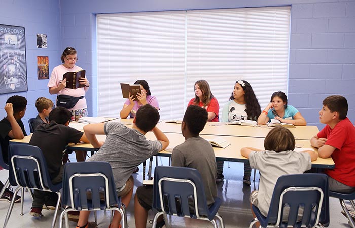 Judy Davis of Lakewood Baptist Church, Beech Grove, teaches students from John 3:16 during Camp Journey.
