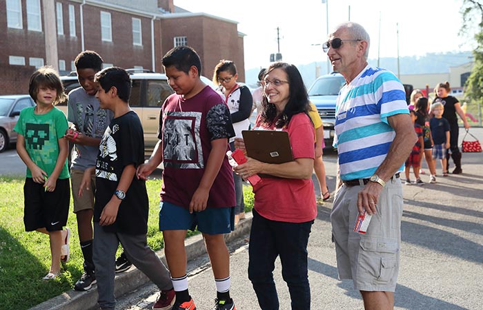 Bill Hickman and Evelyn Keech from Beaver Dam Baptist Church supervise children as they get off the bus.
