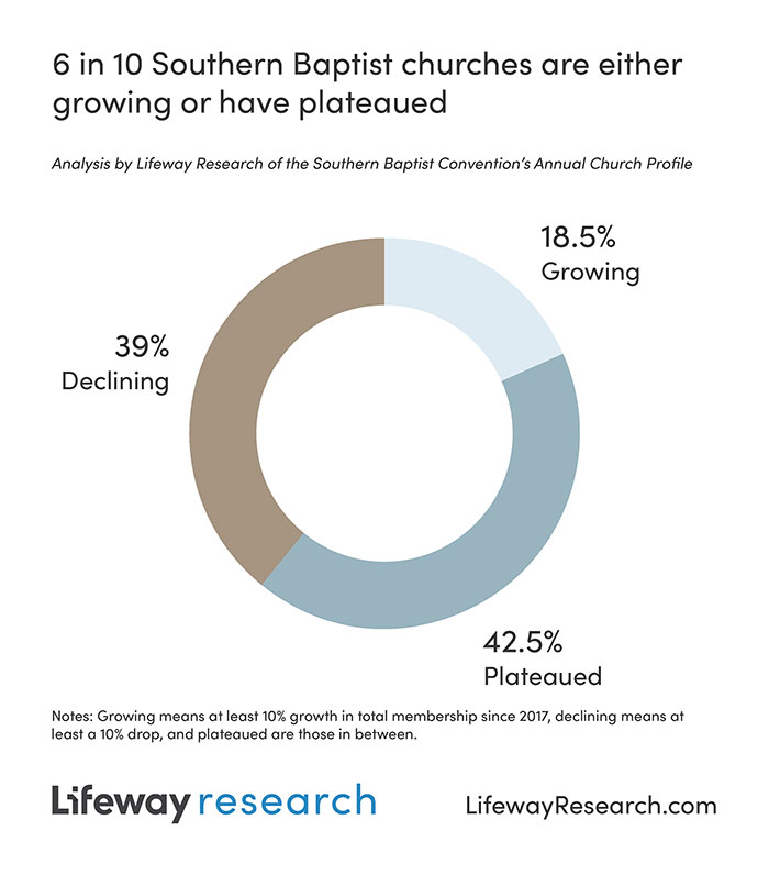 Grouping churches according to their percentage change in membership since 2017 gives a picture of which types of churches are most likely to be growing and which must overcome the trends surrounding them. Those who saw an increase in total membership of 10 percent or more are classified as growing, a decrease of 10 percent or more are considered declining and those in between are plateaued. Overall, 18.5 percent of Southern Baptist churches are growing, 42.5 percent are plateaued and 39 percent are declining.