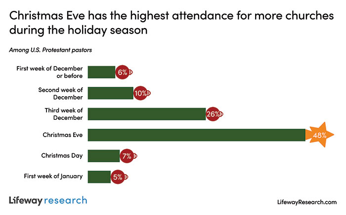 Half of U.S. Protestant pastors (48 percent) say a Christmas Eve service is their churches’ largest event during the holiday season, according to a Lifeway Research study. The frequency of the highest attendance events builds up to Christmas Eve and then tapers off into January.