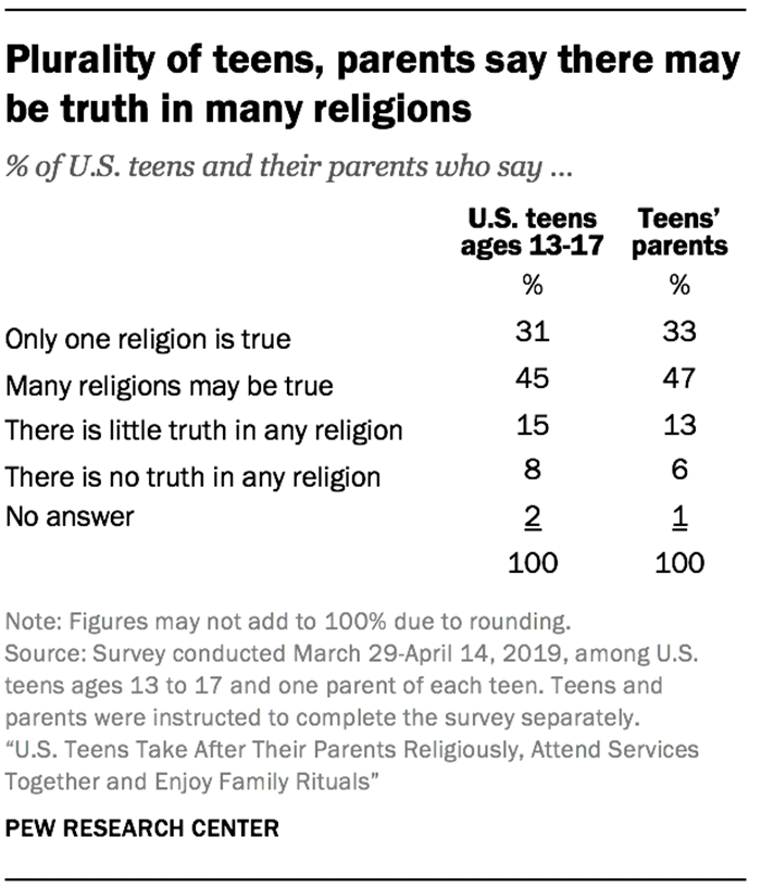 Pew included a teenager and a parent from each household surveyed, and found that the religious beliefs of teenagers largely mirrored those of their parents. The largest portion, 47 percent, of parents included in the study said many religions may be true, compared to 33 percent who expressed an exclusivist view of religion, and 19 percent who said there is little or no truth in any religion.