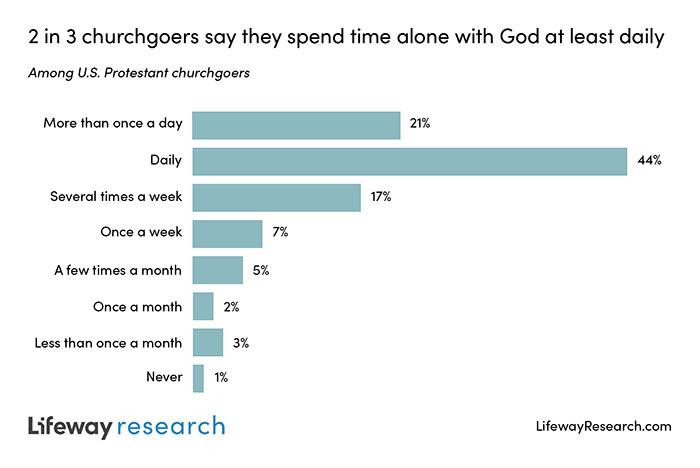 According to a study by Lifeway Research, nearly 2 in 3 Protestant churchgoers (65 percent) intentionally spend time alone with God at least daily, with 44 percent saying daily and 21 percent saying more than once a day. Meanwhile, 17 percent of churchgoers say they are alone with God several times a week, and 7 percent say once a week. Others admit to being alone with God a few times a month (5 percent), once a month (2 percent), less than once a month (3 percent) or never (1 percent).