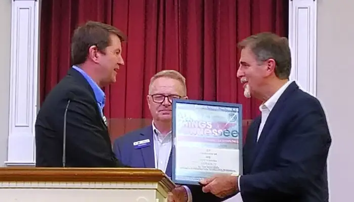 Gene Nelson, left, Harvest Field 6 leader for Tennessee Baptist Mission Board, presents a Golden Offering for Tennessee Missions certificate to David Hawkins, director of missions for Nolachucky Baptist Association. In the background is TBMB staff member William Burton.
