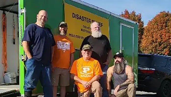 Polk County Baptist Association Disaster Relief recently collected items for flood victims. From left are, standing, John Hardin, Samuel Burget, Wally Whitman; kneeling, Ryan Potts and Bill Repsheer.