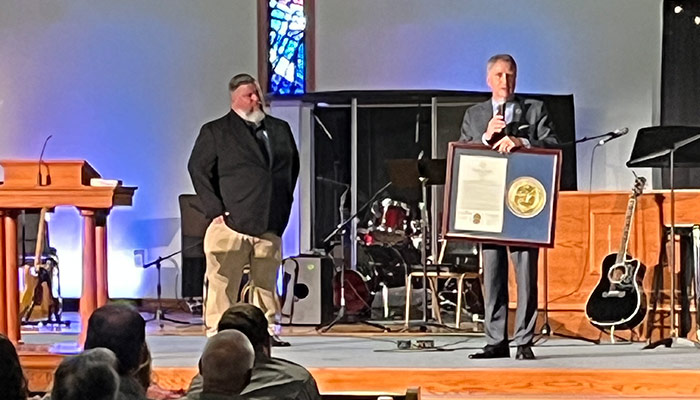 Bethlehem Baptist Church, Springfield, recently celebrated its 185th anniversary. State Senator Kerry Roberts presented the congregation a framed resolution from the Senate recognizing the anniversary. Accepting on behalf of the church is pastor Joshua Culver, left.