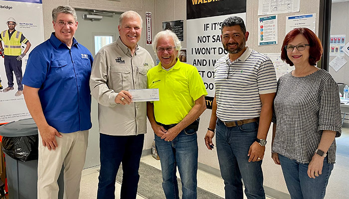 Jerry McEntee, center, and other officials with Walbridge Construction recently gave a $10,000 gift to the TBMB as a “thank you” for the recent luncheon served to over 1,100 workers by TBMB staff and volunteers at the BlueOval City construction site. Accepting the gift for the TBMB were Danny Sinquefield, left, Harvest Field 1 team leader, and Randy C. Davis, second from left, president and executive director.