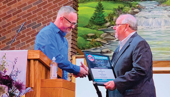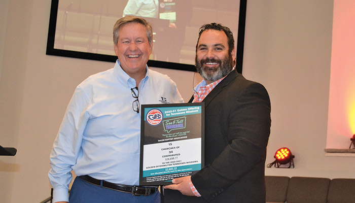 Steve Pearson, left, of the Tennessee Baptist Mission Board, recently presented a plaque in recognition of Salem Baptist Association’s support of the Golden Offering for Tennessee Missions to moderator Dusty Desimone. Desimone was reelected moderator for 2022, which will be the 200th anniversary of Salem Association. — Photo by Donna Nichols
