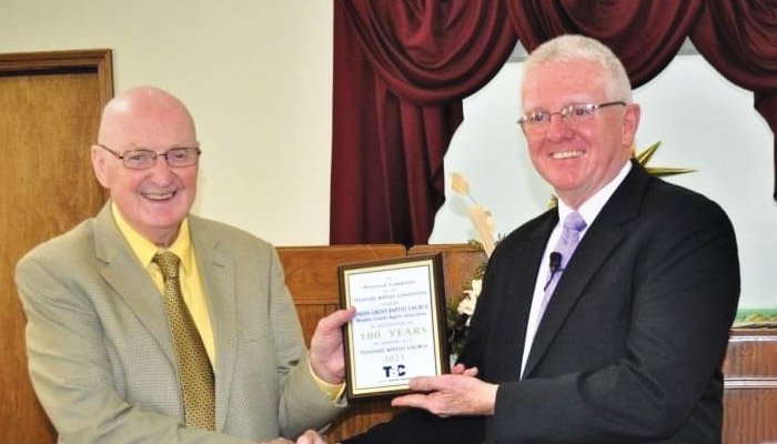Phil Mitchell, right, director of missions for Weakley County Baptist Association, presents a plaque from the Historical Committee of the Tennessee Baptist Convention to pastor Ronnie McClure of Union Grove Baptist Church in recognition of the church’s 100th anniversary.