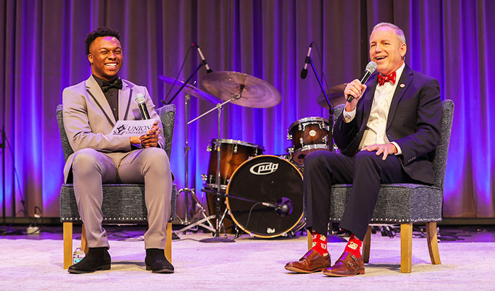 Union University senior Stephen Williams, left, interviews president Samuel W. “Dub” Oliver during Union’s Founders Day chapel service Feb. 3 that marked the university’s 200th birthday. — Photo by Suzanne Rhodes